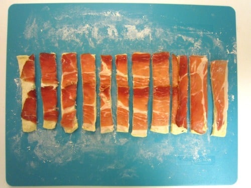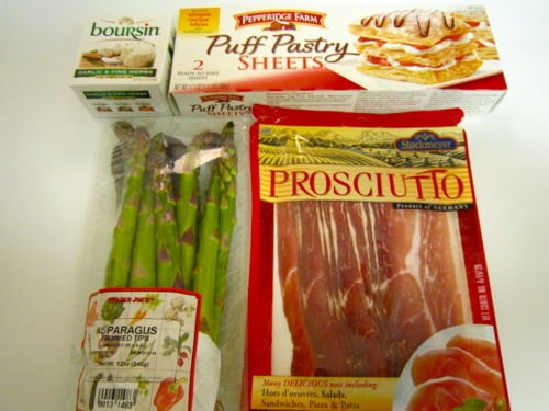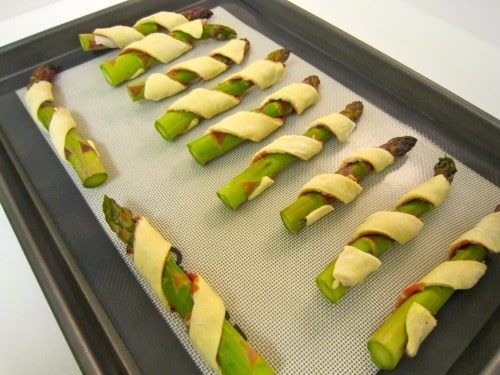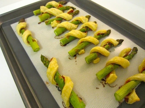 Wrap one pastry strip around each asparagus spear, prosciutto-side in. Place pastries seam-side down onto baking sheet.