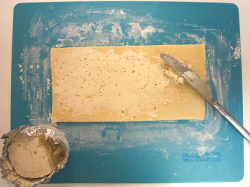 Unfold pastry sheet on a lightly floured surface. Spread cheese on pastry sheet.