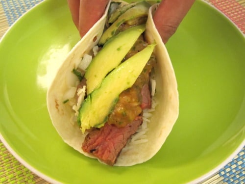 Cook tortillas in a hot pan for 45-60 seconds on each side (this will make them soft and pliable). Add rice, meat, cheese, onion relish, salsa, and top with sliced avocado.