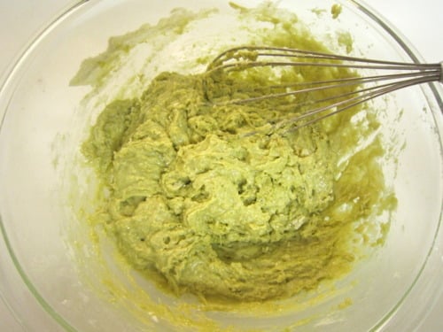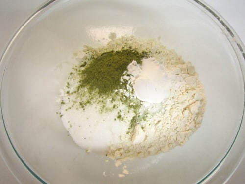 In a small bowl, mix together flour, matcha powder, baking powder, salt, and sugar.