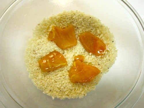 Season chicken pieces with salt and pepper and gently dredge chicken in honey-mustard mixture.
