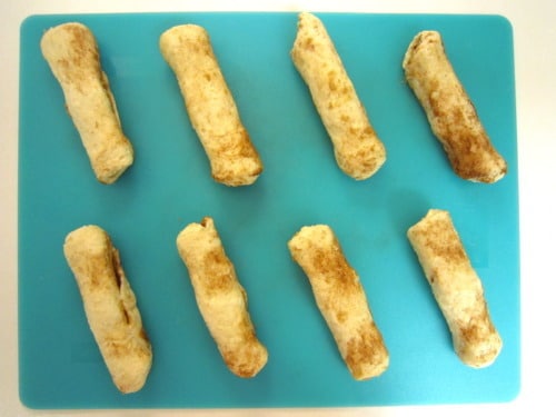 Use a sharp knife and cut 1/2-inch slices and place onto prepared baking sheet. (I cut 5 slices per biscuit making 40 small cinnamon rolls.)