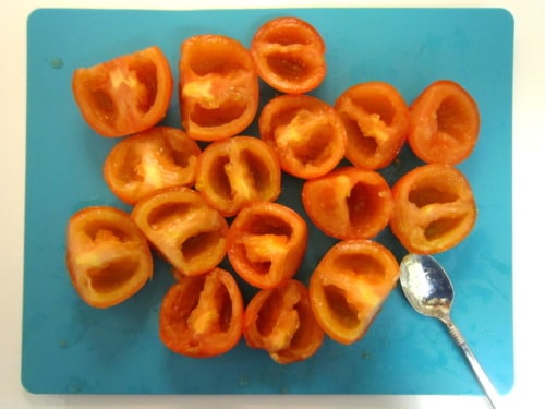 Slice the tomatoes in half and spoon out the seeds.