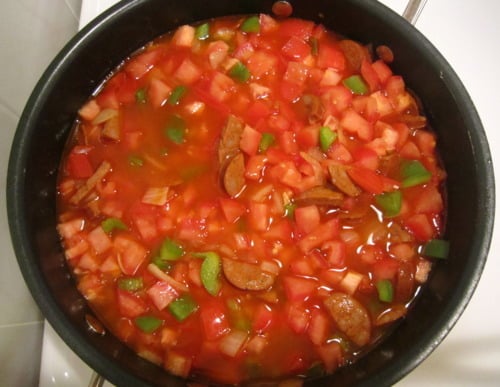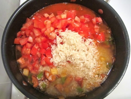 Add the tomatoes, rice and 3 cups water to skillet.