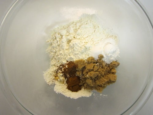 In a medium bowl, combine the flour, brown sugar, baking powder, salt, cinnamon, nutmeg, ginger and cloves.