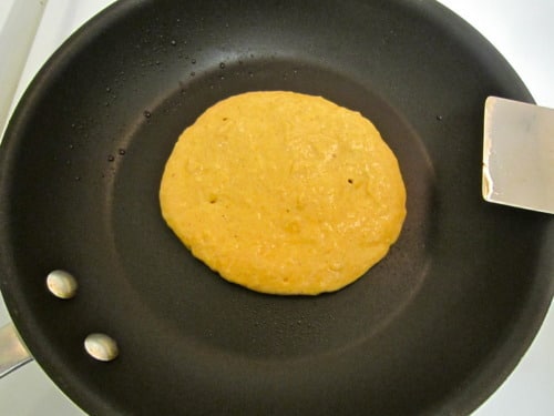 Heat a nonstick pan or cast iron griddle over medium heat. Add a pat of butter and heat until the butter just begins to sizzle. (I just used nonstick cooking spray). Scoop a scant 1/4 cup batter into the pan or onto the griddle and cook until bubbles appear on the top surface and the bottom is golden brown, about 1 to 1 1/2 minutes.