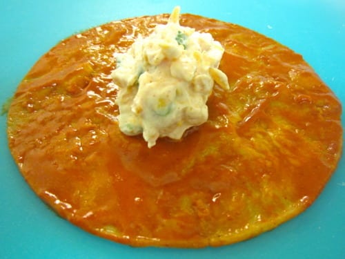 Lay the tortilla on a plate; spoon a heaping 2-3 tablespoons of the sour cream mixture in the center.