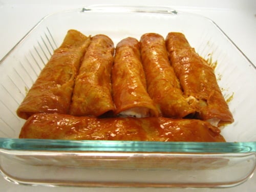 Roll the tortilla and place seam side down onto prepared baking dish. Repeat with remaining tortillas and sour cream mixture. (The leftover sour cream mixture is perfect as a tortilla chip dip!)