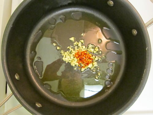 While the pasta is cooking, heat olive oil over medium heat in a large saucepan. Add the garlic and red pepper flakes and saute until fragrant, about 1-2 minutes.