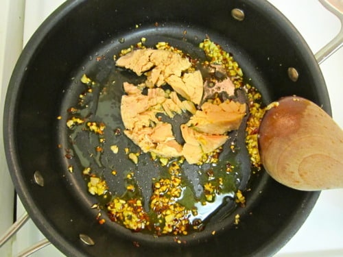 Add the tuna, breaking it up with a wooden spoon.
