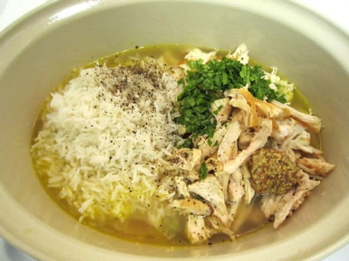 Add the chicken, chicken broth, rice, Dijon, 1/4 teaspoon salt, pepper and parsley.