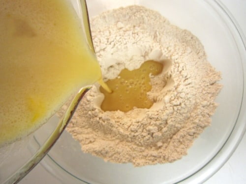 Pour mixture over dry ingredients and stir using a rubber spatula just until moist.