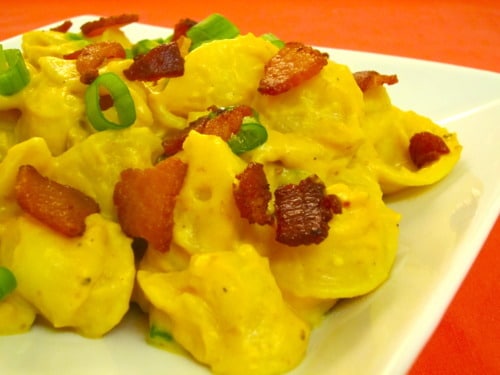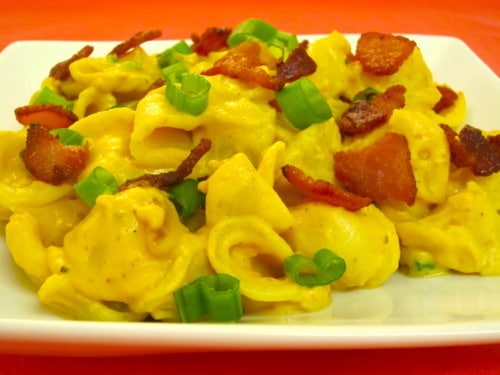 Whatās great about this recipe is that itās a simple pasta dish where you get to prepare everything while the pasta is cooking so once the pasta is done, you could toss it in this creamy pumpkin sauce, which is a bit similar to butterut squash, and then top it off with some crumbled bacon and green onions, giving you a bit of saltiness and freshness in every bite. Light cream cheese and fat free evaporated milk can definitely be substituted for a lighter dinner.