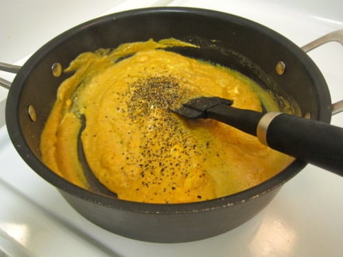 Heat a large saucepan over medium high heat. Add the pumpkin, cream cheese, evaporated milk, garlic, salt and pepper.