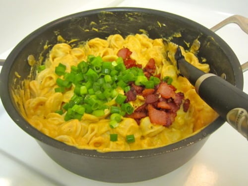 Add the bacon, reserving some for garnish, along with the green onions and gently toss to combine.