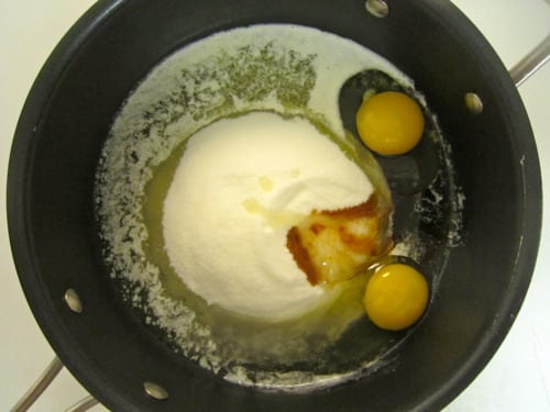 Add the sugar, eggs and vanilla, whisking until well combined.