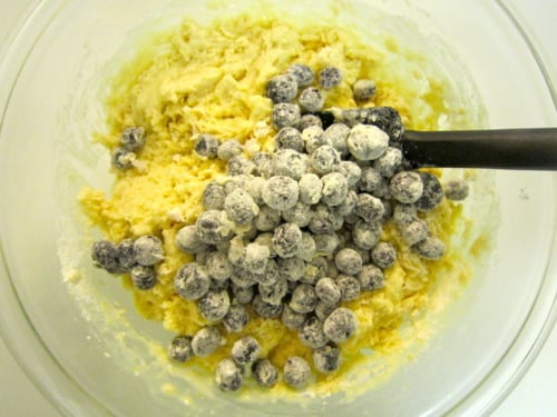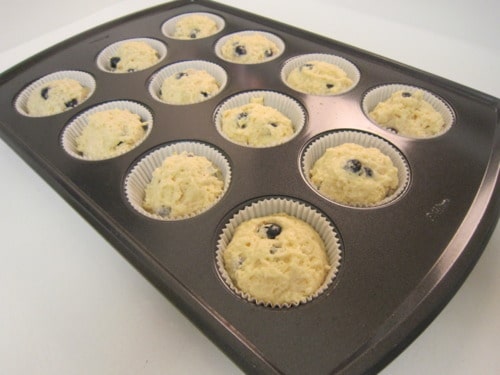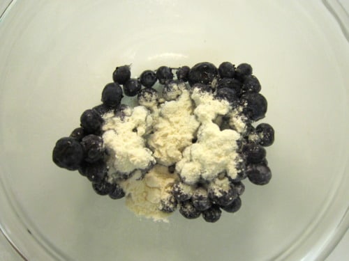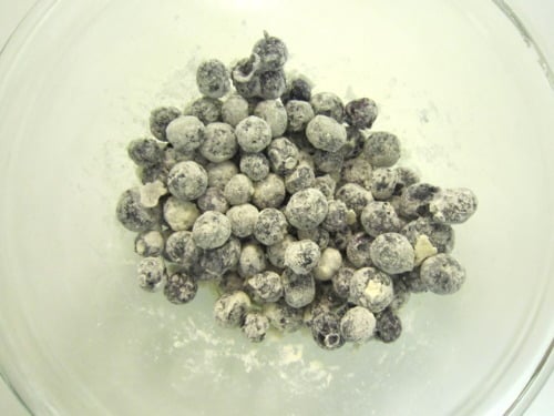 In a small bowl, combine 1/4 cup flour and blueberries. (This prevents the blueberries from sinking to the bottom of the muffins.)