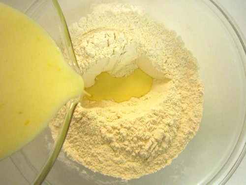 Pour mixture over dry ingredients and stir using a rubber spatula just until moist.