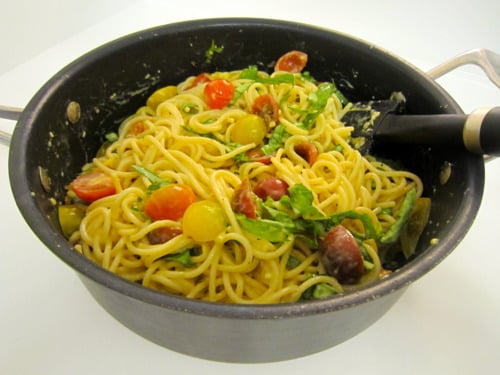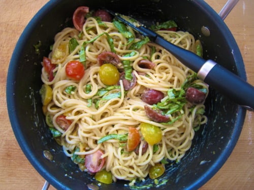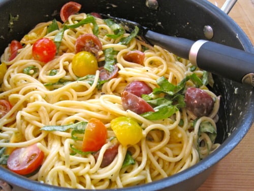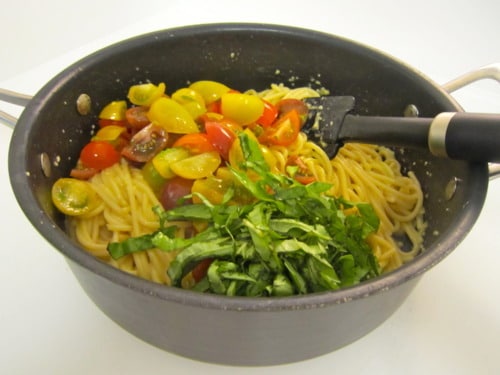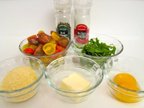 Every time Jason leaves for school in SF, I tend to become a temporary vegetarian. If I’m just cooking for one, I’m not going to buy a steak and grill it for myself. So when he’s gone, I like to make quick, simple meatless recipes like this one. It’s not only made with everyday ingredients but it’s the healthiest dinner I’ve ever made. It’s low in calories and it’s full of flavor! There’s a bit of a light creaminess from the raw egg yolks, a little bit of salt from the Parmesan, juicy, fresh flavors when you bite into the tomatoes, and a lasting refreshment from the basil. Now who says healthy food can’t be delicious?