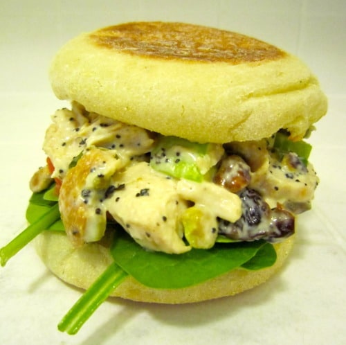 Not only is this chicken salad super easy to make but it is packed with tons of flavor – from the tart apple to the sweet cherries along with the added crunch of the pistachios and poppy seeds. I made it a bit more healthy, using both mayonnaise and plain yogurt, which gave it a nice, light creaminess to it. You can eat it on top of some spinach or make it into a sandwich, like I did. I love a nice, toasted English muffin so I stuffed some chicken salad, spinach, and tomatoes right into the center and devoured it in less than 5 minutes. It was a perfect lunch meal, and I’m sure I’ll make it again and again.