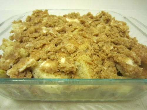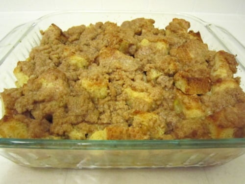 Sprinkle the streusel topping evenly over the bread cubes.