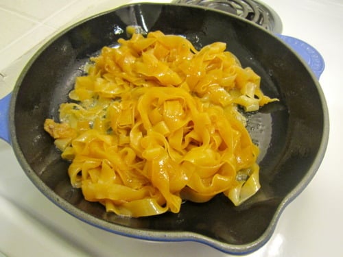 *Note: I couldn’t find fresh noodles and these were the widest that I could find so I boiled them just until al dente and then finished them off in the skillet.