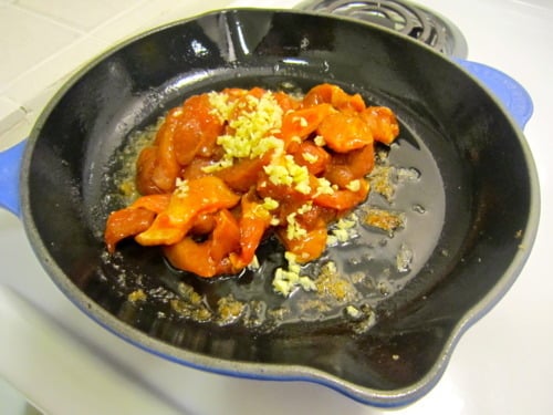 Add remaining 1 tablespoon vegetable oil, garlic and marinated pork to the skillet. Cook, turning occasionally, until cooked through, about 4-5 minutes.