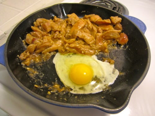 Push the pork to one side of the pan and add the egg to the skillet.