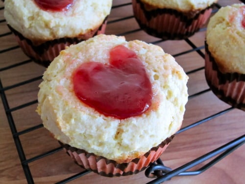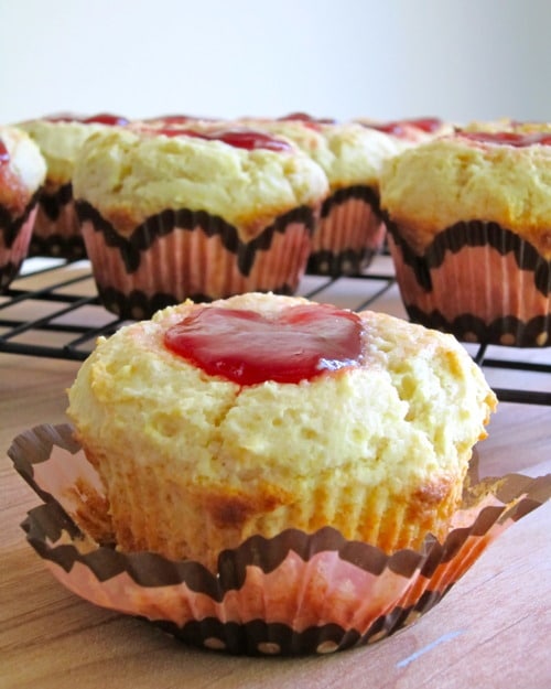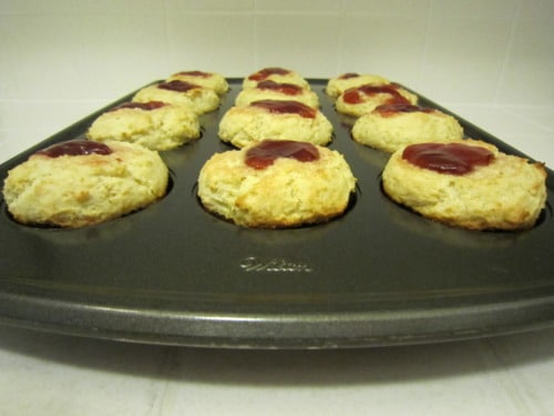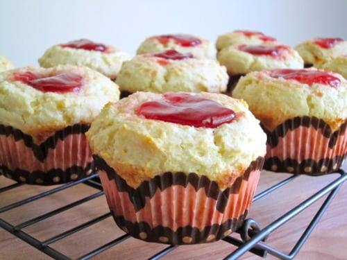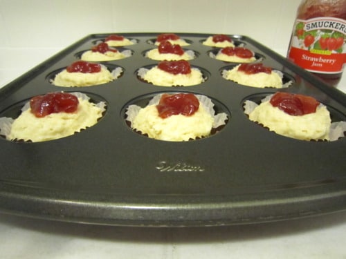 Make a well into each muffin top and drop 1 teaspoon strawberry jam into the center of each cup. (If the well is not large enough, the jam will ooze out while it is baking and it won’t be pretty. It’ll still be tasty, just not aesthetically pleasing to look at.)