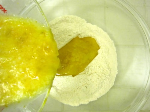 Pour mixture over dry ingredients and stir using a rubber spatula just until moist.