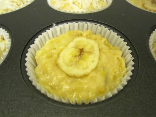 I wanted to be more decorative so I topped some of the muffins with a banana chip. A slice of fresh banana also works well.