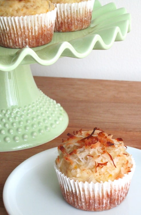 Until that vacation happens, I have these muffins to keep me company. It has a banana muffin base with orange zest and shredded coconut, giving you a nice well-balanced tropical muffin filled with fun, fresh flavors. It’s a tropical paradise right in your kitchen.