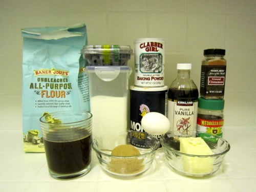 In a large glass measuring cup or another bowl, whisk together the butter, coffee, sugars, egg and vanilla.