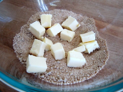 Add the cold butter and toss to coat, using your fingers to work the butter into the dry ingredients until it resembles coarse crumbs. Set aside in the refrigerator.