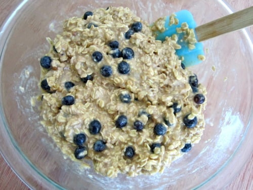 Let mixture stand at room temperature for 5 minutes. Stir in the eggs, baking powder, salt and blueberries.