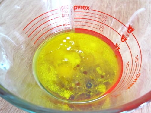 In a large glass measuring cup or another bowl, whisk together the milk, olive oil, eggs and vanilla.