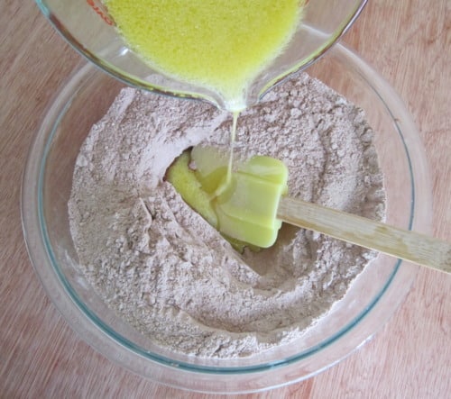 Pour mixture over dry ingredients and stir using a rubber spatula just until moist.