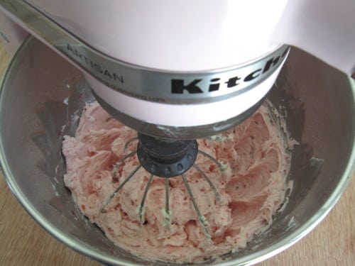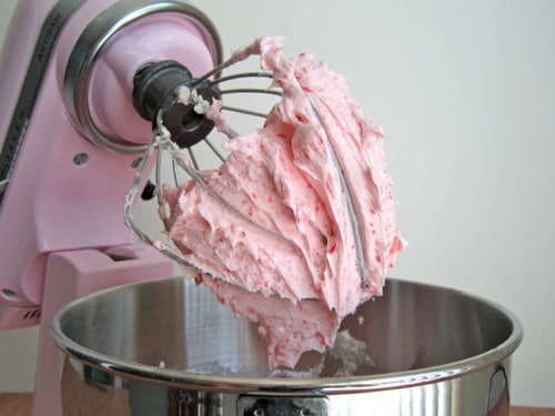 Add 1/2 cup strawberry puree. Increase the speed to medium high and whip until the frosting is light and fully, about 2 minutes.