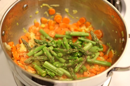 Add in the asparagus and cook until the veggies become just tender-crisp, about 5 minutes more.