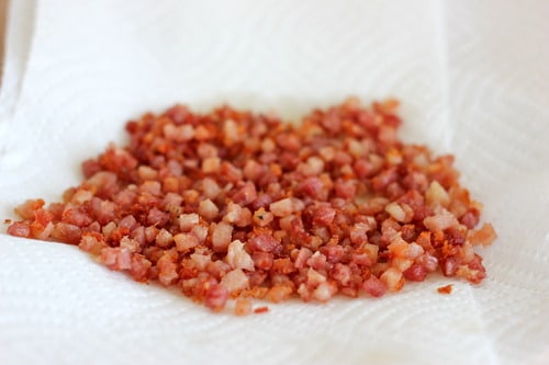 Letās first start off with some pancetta. I used to get it in a huge chunk from my local Italian bakery but Iāve been too lazy to drive all the way out there so I just pick up the pre-cut ones from Trader Joeās.