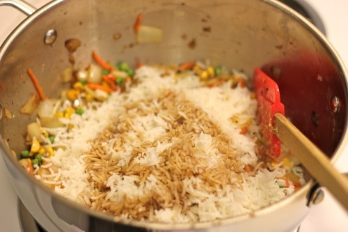 Add the rice and soy sauce and gently toss to combine. Cook, stirring constantly, until heated through, about 2 minutes.