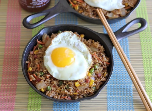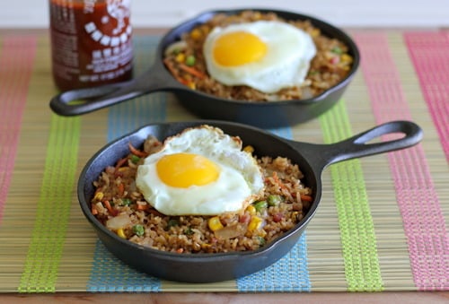 I made it with brown jasmine rice, and I scrambled / fried 4 eggs in the skillet off to the side of the fried rice to mix it into the dish for simplicityās sake. I also added some sliced baby Bella mushrooms since I wanted to use them up, and I think they went great with the dish. I wish Iād made a double batch so we had some more leftovers! Thanks for sharing the recipe!