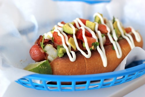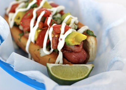 Bacon-wrapped Sonoran hot dog topped with avocado, tomato, onion, and drizzled with crema, served with a lime wedge.