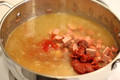 Next we’ll stir in everything else – hot dogs, banana ketchup, tomato paste, beef stock, flour dissolved in 1 cup water and an additional 1 cup water.