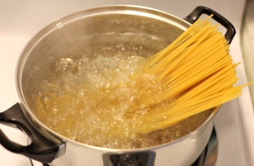 Let’s first boil up some water to cook our spaghetti noodles.