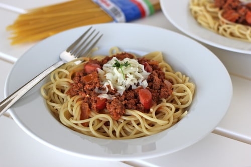 Now what exactly is Filipino spaghetti? Well, imagine a traditional bolognese sauce. It’s meaty. It’s hearty. It’s just downright amazing, right? But then take that sauce, load it up with cut-up hot dogs, and then simmer that in a sweetened tomato sauce. Incredible, right?!