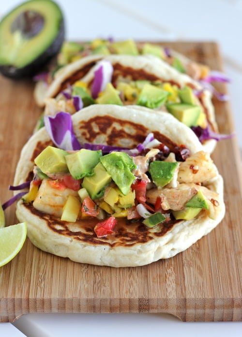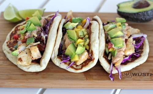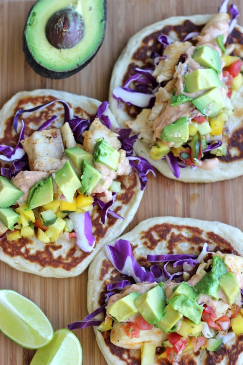 I don’t even know where to begin with these tacos. Seriously. It’s probably the best tacos I’ve had in my entire life. No joke. If I could, I’d eat this every. single. day. I mean, it’s a buttery biscuit base as the tortilla filled with super zesty lime tilapia blooming with chipotle pepper flavor topped with fresh mango salsa drizzled with chipotle sour cream and topped with fresh avocado (wow that was a mouthful). Are you not dying yet?! I mean I’m having some major fish taco cravings just looking at these photos!