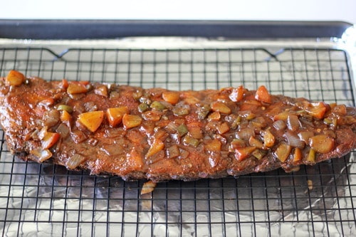 So as you’re fighting all your urges to dig in, let’s slather on that BBQ sauce and pop it back in the oven. Be sure to baste every 15 minutes for the next 30 minutes.