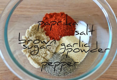 To make the spice rub, combine the brown sugar, paprika, garlic powder, salt and pepper in a medium bowl.