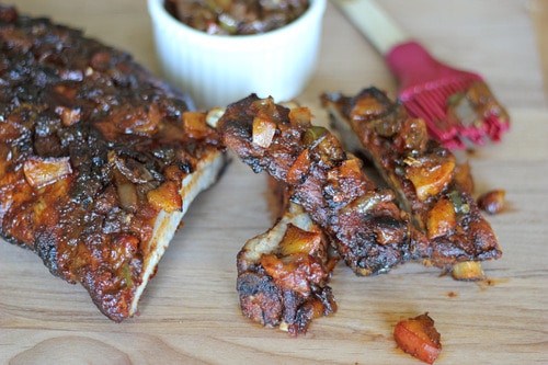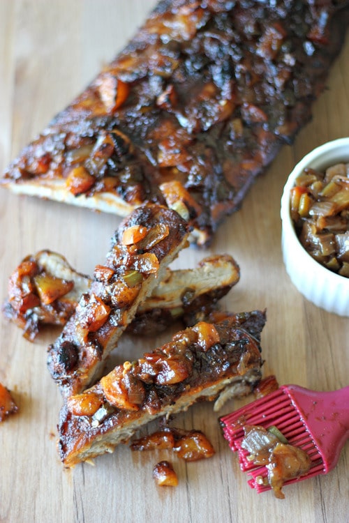Baby Back Ribs with Balsamic Peach BBQ Sauce (adapted from The Pioneer Woman and Savoring the Thyme):